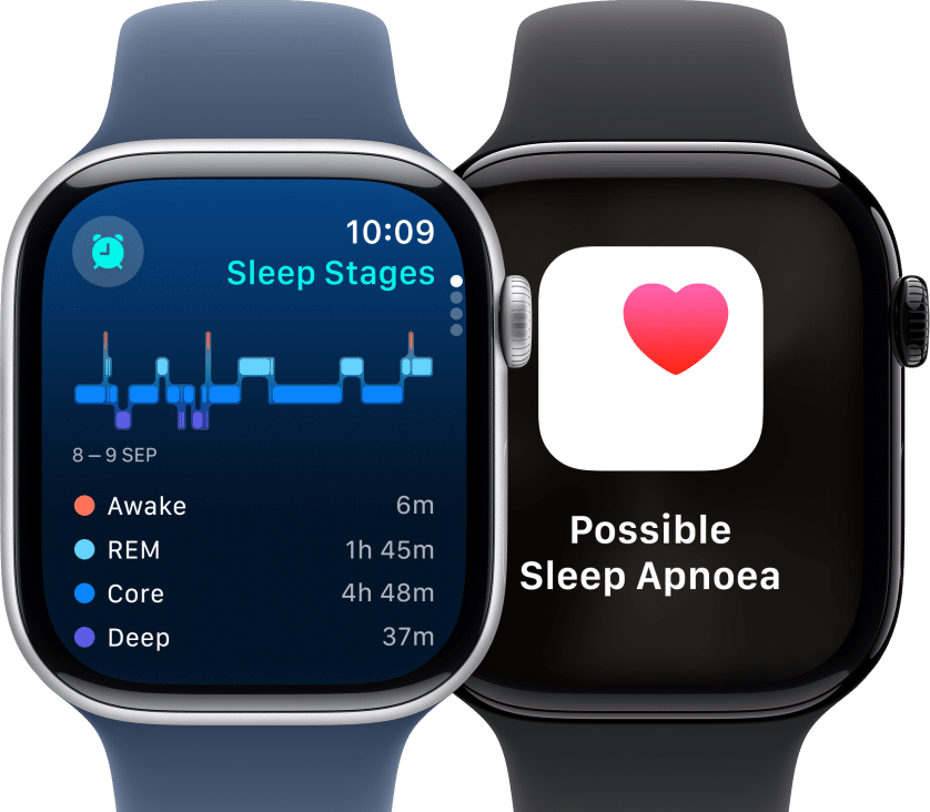 Sleep Apnoea Notifications: The Sleep Apnoea Notification Feature is available on Apple Watch Series 9 and later and Apple Watch Ultra 2. It is intended to detect signs of moderate to severe sleep apnoea for people 18 years old or older without a diagnosis of sleep apnoea.